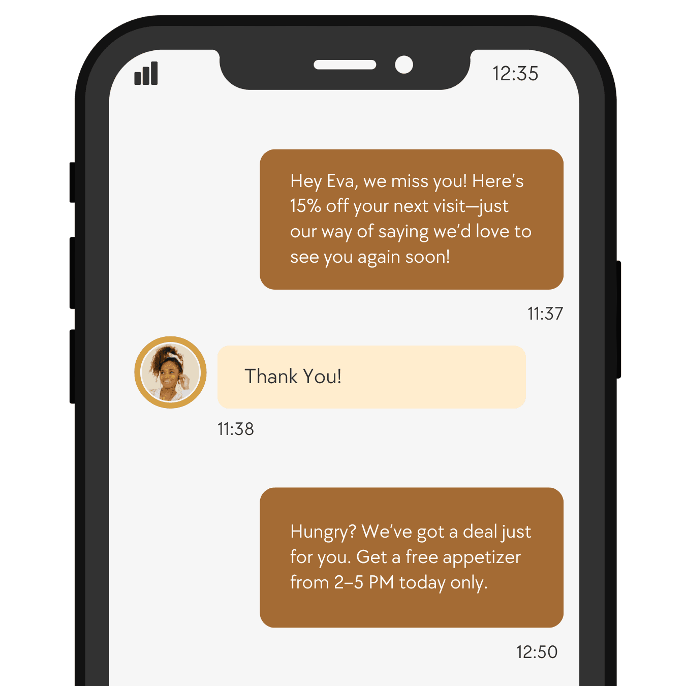 - Got empty seats during certain hours? Send a targeted deal and turn slow periods into busy ones.